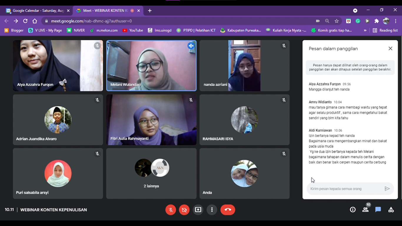 Sabtu, 14 Agustus 2021, via Google Meet. Alhamdulillah telah terlaksana salah satu kegiatan utama dalam pelaksanaan KKN DR di Perumahan Bumi Jaya Indah. Kegiatan utama dengan metode pemberdayaan, tepatnya peberdayaan remaja lingkungan sekitar. Melalui kegiatan Webinat Konten Kepenulisan kami berharap dapat mengembangkan minat bakat para remaja dan kaum muda di lingkungan Perumahan Bumi Jaya Indah.